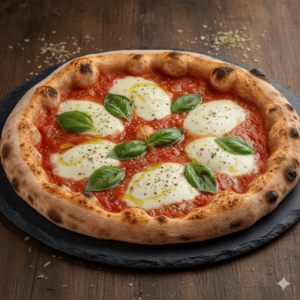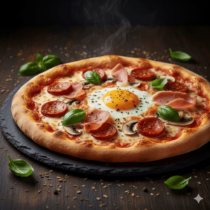 Base tomate, mozzarella, jambon, merguez, chorizo, champignons, œuf