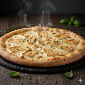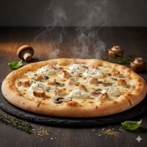 Base crème fraîche, mozzarella, poulet, boursin, champignons