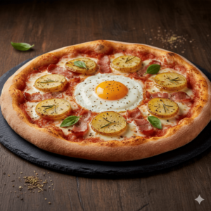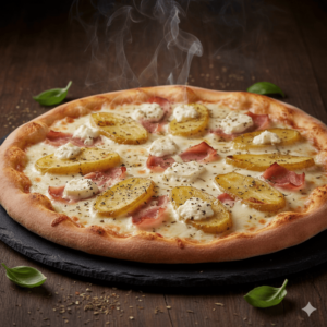 Base tomate, mozzarella, lardons, pommes de terre, œuf