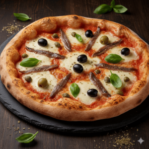 Base tomate, mozzarella, merguez, poivrons, oignons, olives, œuf