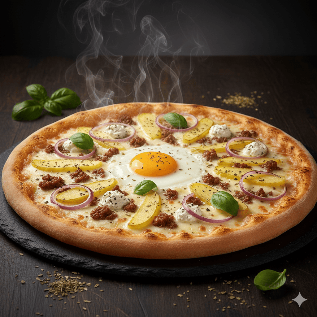 Base crème fraîche, mozzarella, viande hachée, pommes de terre, boursin, œuf