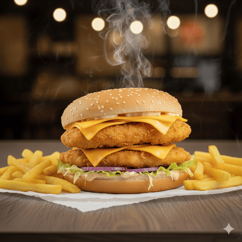 Cheddar, 2 steaks de boeuf 45g, bacon, oignons grillés
