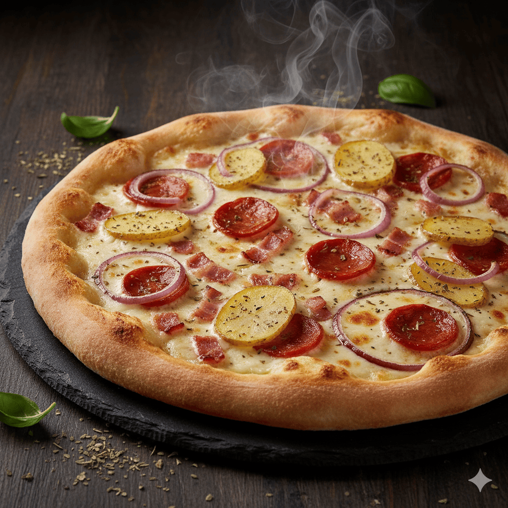 Base crème fraîche, mozzarella, lardons, chorizo, pommes de terre, oignons