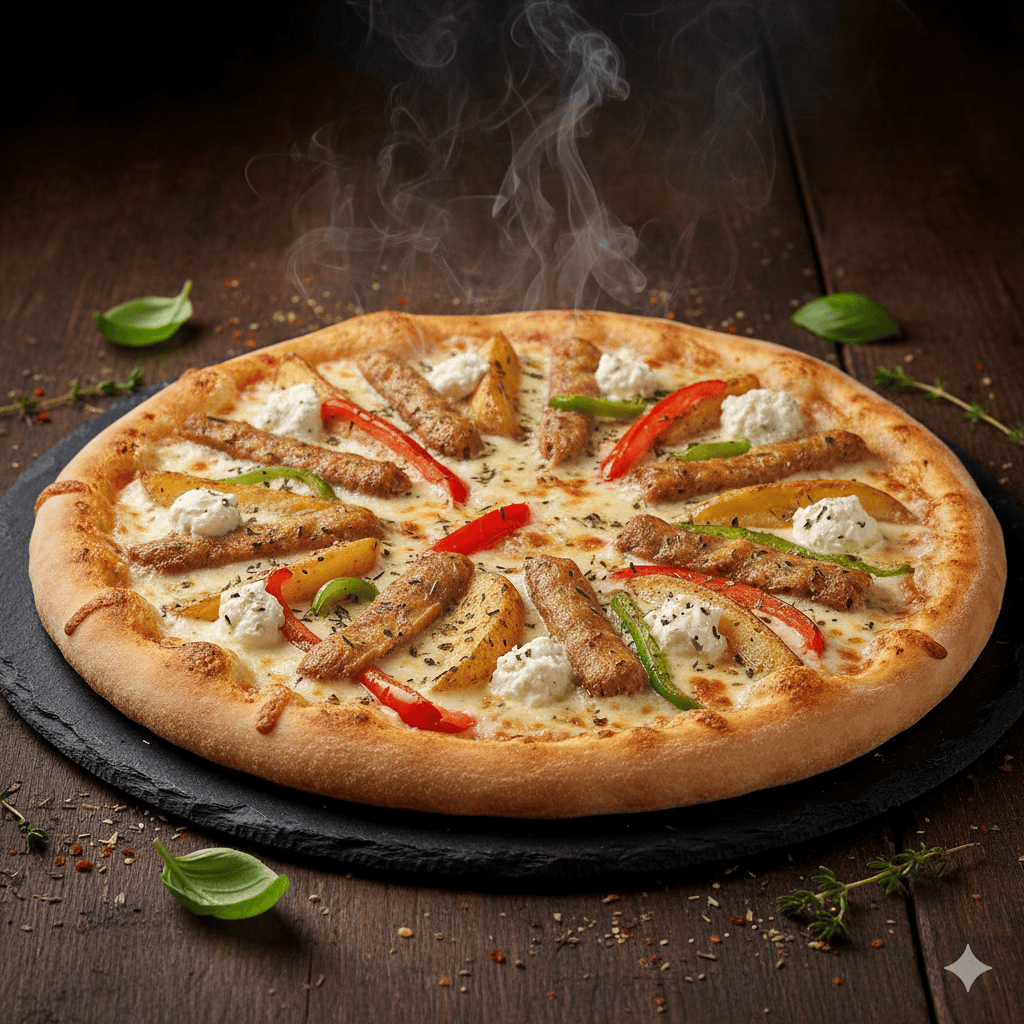 Crème fraîche, mozzarella. Kebab, pommes de terre, poivrons, boursin