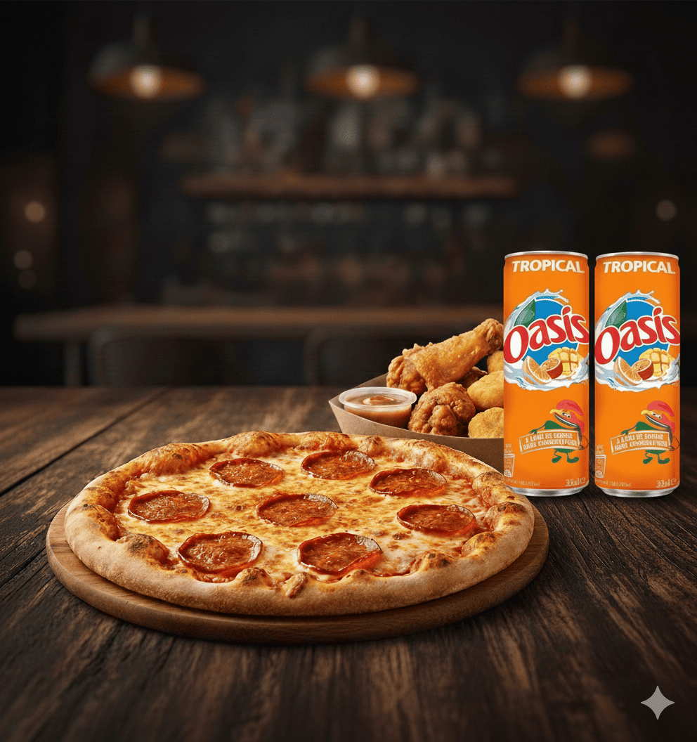 1 pizza méga (au choix)+ 12 wings ou 12 nuggets ou 1 glace 500 ml + 1 maxi coса 1,5