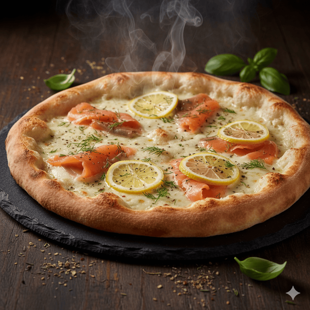 Base crème fraîche, mozzarella, saumon fumé, citron