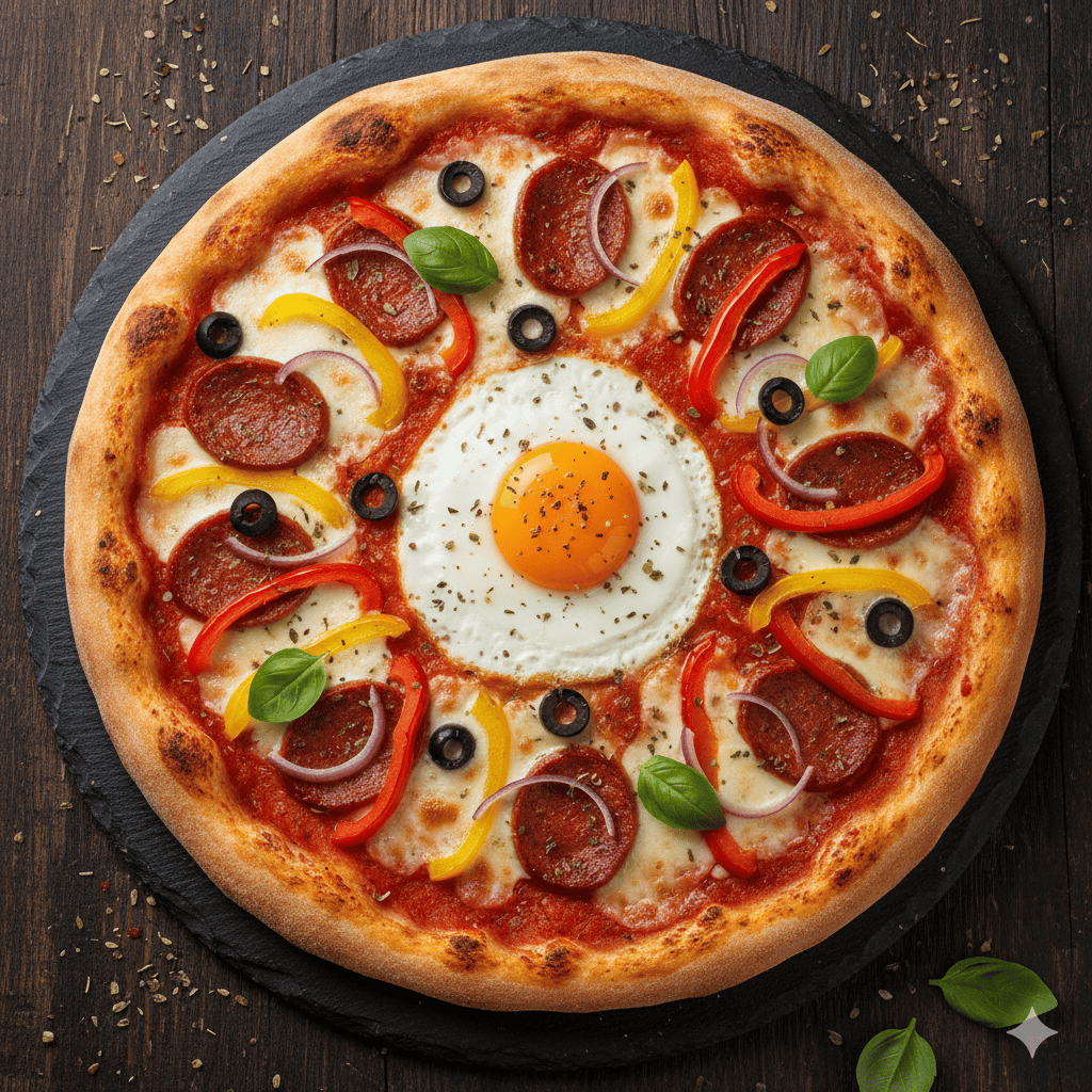 Base tomate, mozzarella, merguez, poivrons, oignons, olives, œuf