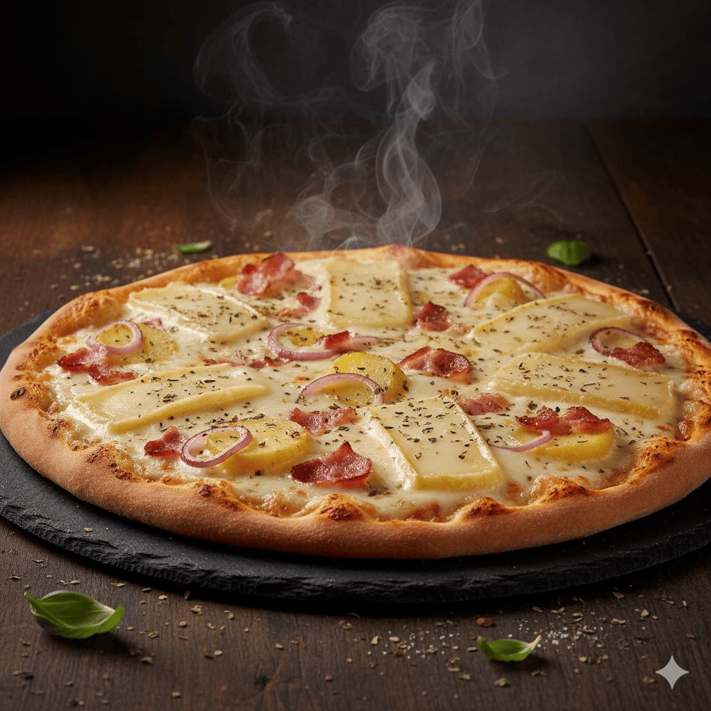Base crème fraîche, mozzarella, pommes de terre, lardons, reblochon, oignons