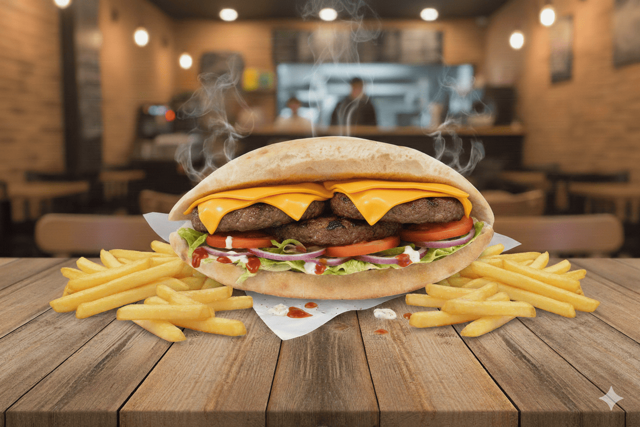 2 steaks 45g, galette de pommes de terre, cheddar, frites