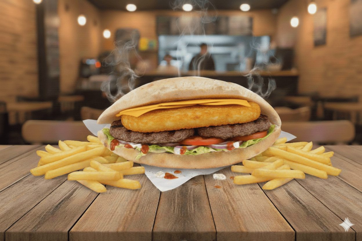 2 steaks 45g, galette de pommes de terre, cheddar, frites