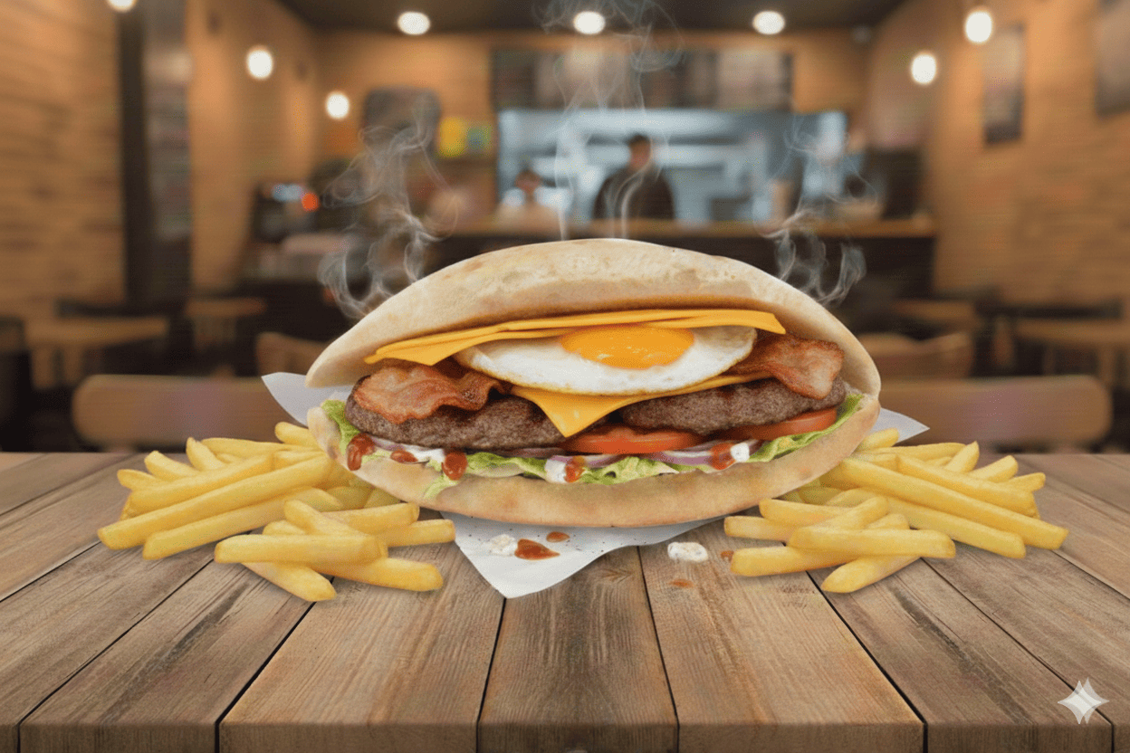 2 steaks 45g, cheddar, bacon, oeuf, frites